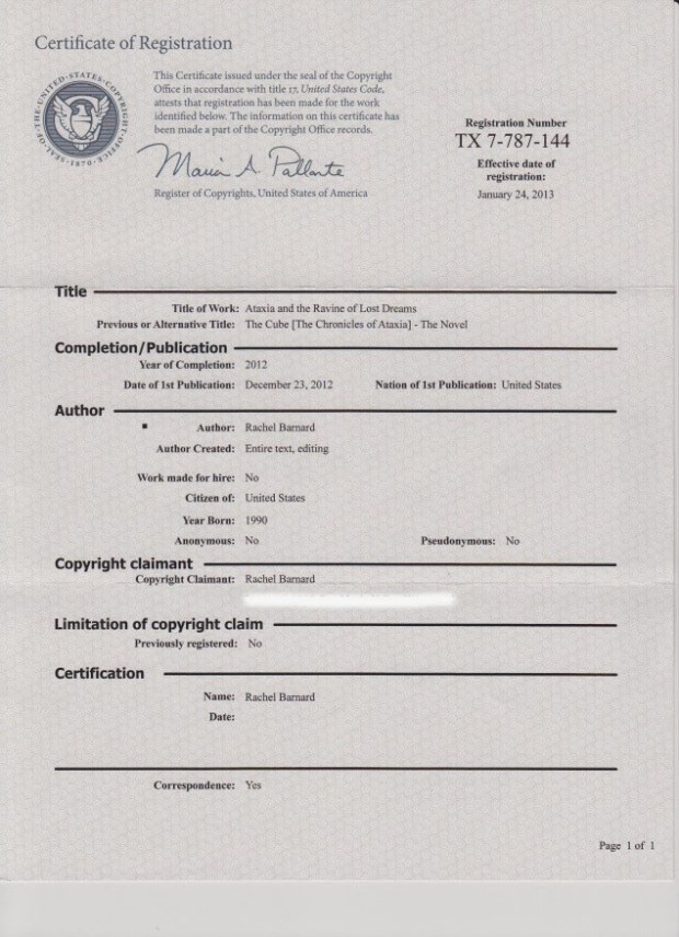 It has been over a year in coming but I finally received my official copyright for my very first published novel: Ataxia and the Ravine of Lost Dreams.