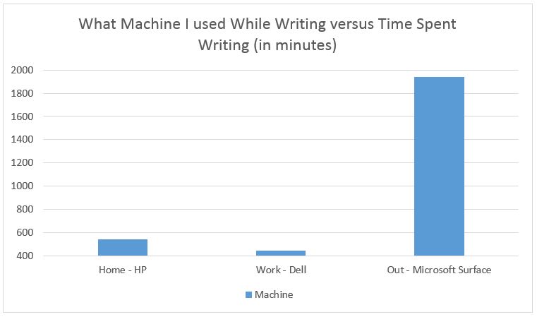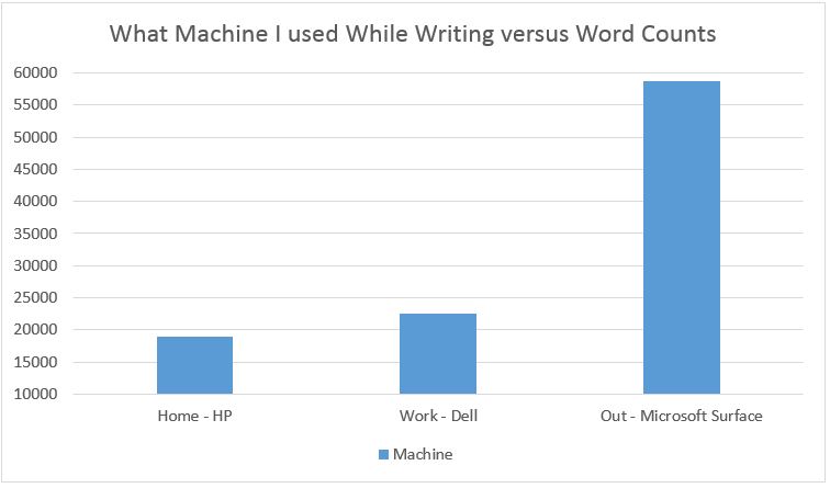 Writing at work was most productive for me, though I spent the most time and wrote the most words on my itty bitty Surface Tablet