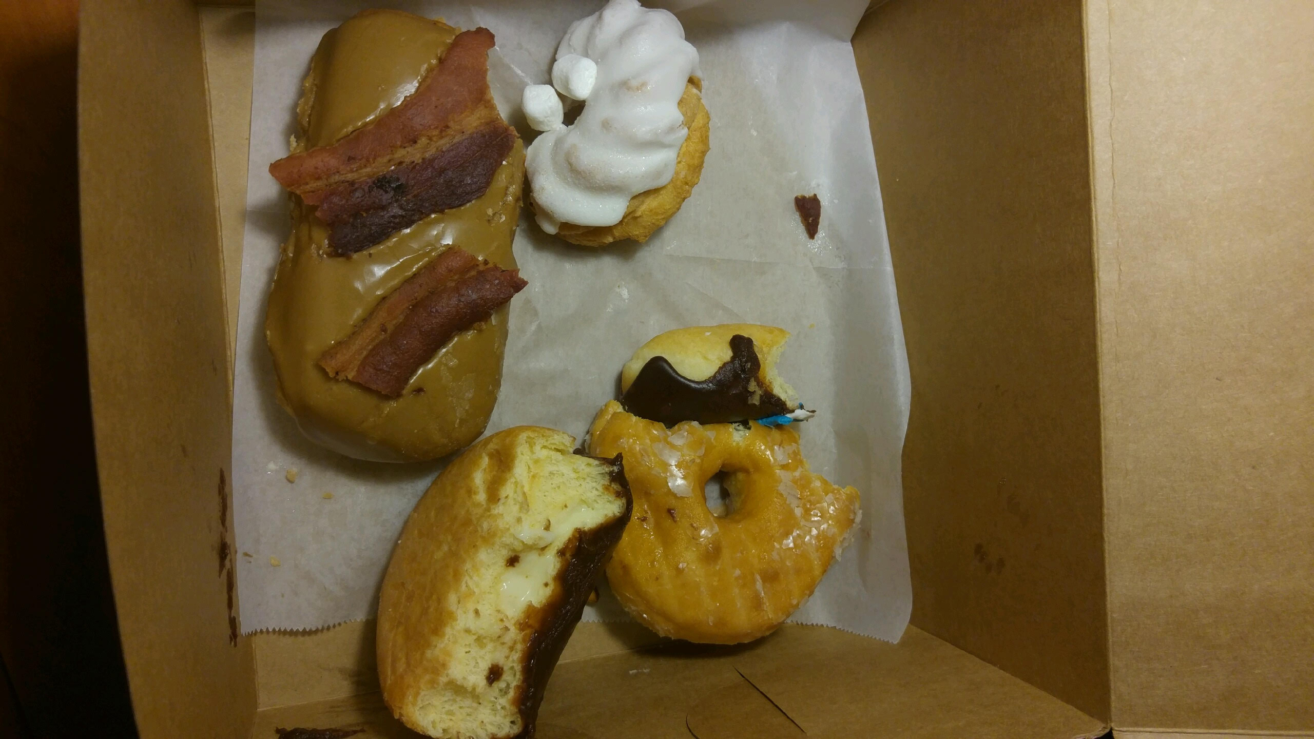 Bacon Maple Bar, Portland Creme, Raised Glaze, Voodoo Doll, Lemon Chiffon Crueler.