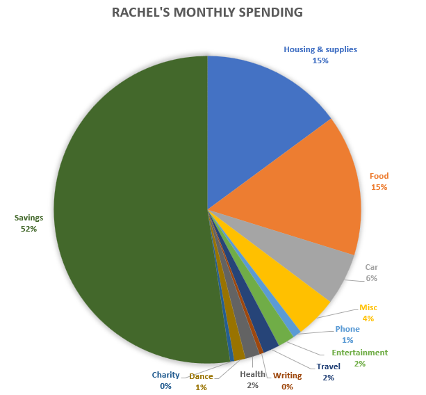 My main goal for the year was to save as much money as possible! I’m doing this by earning more money, spending less money, and investing the money that I do have. Here is my monthly budget spreadsheet:
