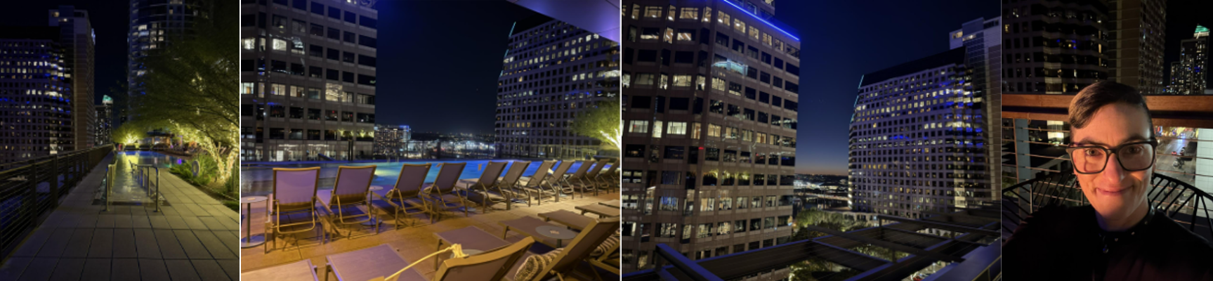 I did pop into the restroom (solid facilities, no notes), and on my way out, I found an unlocked door near the back entrance to the pool area. I stepped out briefly to snap a photo of the gorgeous nighttime skyline view from up there. The pool looks nice, if not small.