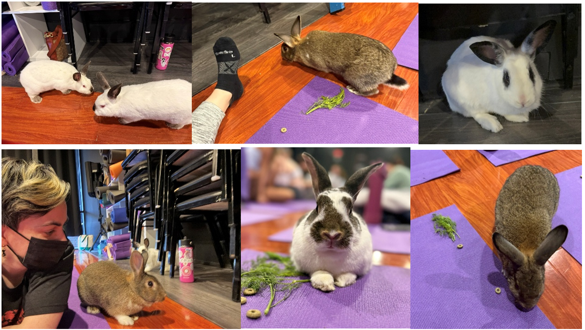 The bunnies were definitely more skittish. Some of them hid out and lounged in the little litter box/potty buckets the entire time. But there were a few brave buns hopping around the room, munching on greens, and one true daredevil who confidently jumped into a couple of people’s laps. It was chaotic and adorable, and the easiest yoga class you can find.