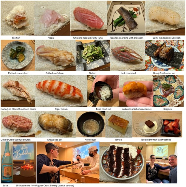 My second time going to this outstanding Austin omakase with now James Beard-nominated chef – Michael Che! Jon got another cake from Upper Crust Bakery that was so good we couldn’t help eating all the leftovers after feeding the other 8 people at the Omakase (including the chef and other employee/owner).