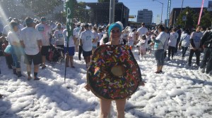 During the race: We ran and weaved and dodged around the bubble foam and the walkers to clock in around 9:30 for this “official” 5k. Overall we had fun, but I won’t be doing it again. When asked about parking for this event, the volunteer at race packet pickup the day before told me, “get here an hour to an hour and a half early and pray.” We took my Miata and found a discarded squeeze of a spot a couple blocks away without trouble. Yay Paul for parallel parking so well. The event was packed! I’m not fond of crowds and would prefer to run a 5k without this many people. If you’re looking to run the entire time, this is not the event for you. Bottlenecks slowed us down at the four bubble stations throughout the course. It was fun to go through the bubble/foam machines, but I was trying to run the event in less than 30 minutes, so this made it quite the challenge. This run also included two slow hills. It was cool to run out halfway and then back – so you knew when you were halfway and could run alongside those making their way back (the other side of the street).