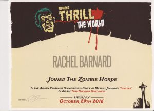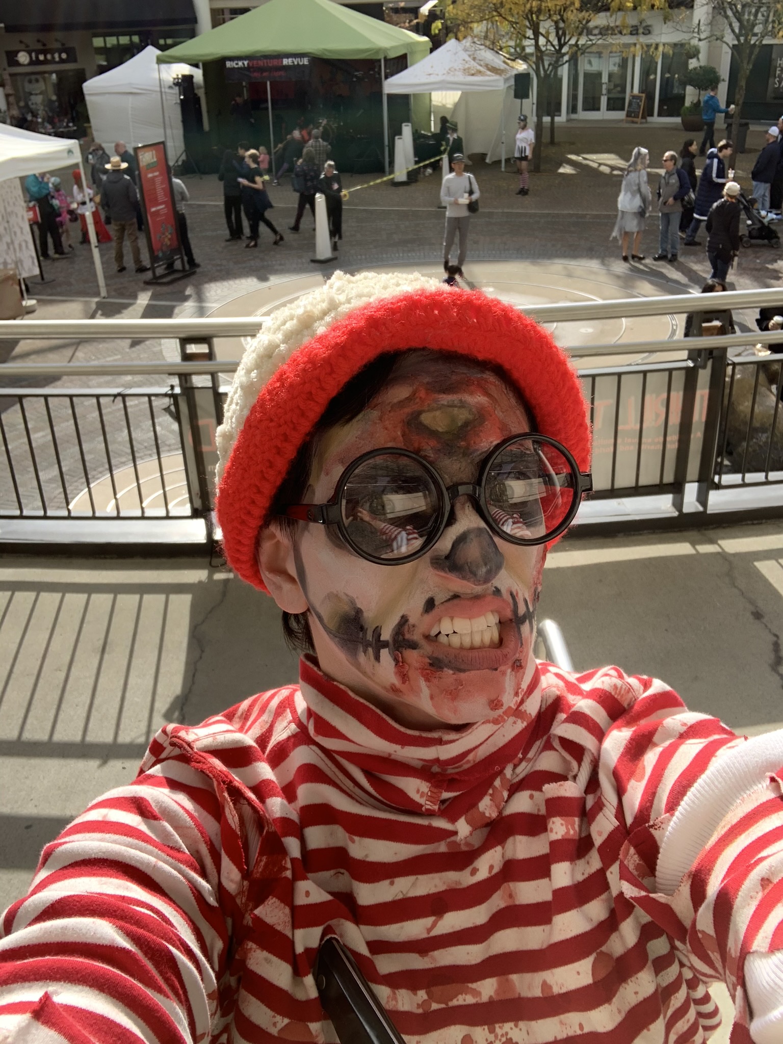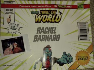 Thrill the World! I’ve participated since 2015. Every year I’ve been Zombie Waldo – with various accessories and different makeup. See if you can spot me in this year’s video.
